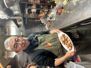 続いて、ちょうど栗が季節ということで、「栗のパエリア」、さらにマルシェで貴重な葉ニンニクを見つけたのでということで「スペインの皮付き豚と葉ニンニクを使った回鍋肉」皆さん、あっという間に完食されてました。
