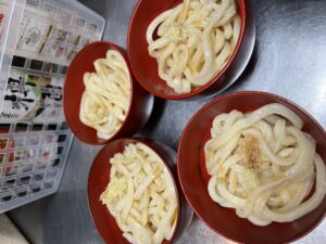 スタッフと縁がある讃岐うどんの日の出製麺所がちょうど催事で東京に出展しており、普段は香川にいかなければ食べられない日持ちしない麺をわけてもらったので、締めに釜玉うどんもご用意しました。